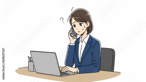 電話でクレーム対応をして困っている日本のビジネスウーマン - PC操作とトラブル対応のアニメ・ウェブトゥーン風イラスト