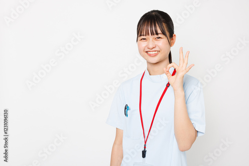カメラに向かってポーズをとる看護師の制服を着たアジアの 10 代の少女