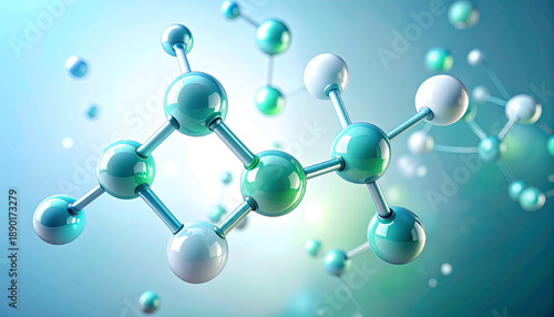美容成分の分子構造イメージ 青と緑の3D分子 先端科学 スキンケア 化粧品研究 背景素材 / Molecular structure of beauty ingredients blue and green 3D molecules advanced science skincare cosmetic research background