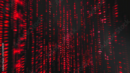 A futuristic display of glowing red binary code and digital patterns, symbolizing technology, cybersecurity, and data processing in a virtual environment..