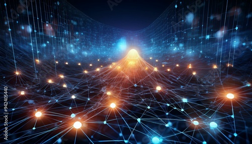A glowing network of interconnected data points in a dark, gradient background, with one cen