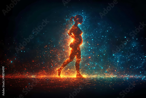 A pregnant woman doing exercises blend geometric lines and shapes and glowing dots, with geometric lines and glowing dot