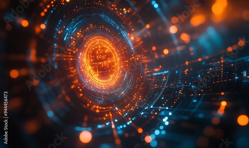 Abstract technology background with geometric circles and dots, simple vector illustration of abstract shapes in orange on a dark blue background design