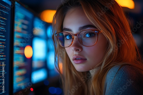 AI cyber security concept. Diverse IT specialist team analyzing artificial intelligence online risk threats to consumer data & privacy. Software developers coding & ethical hacking in dark office