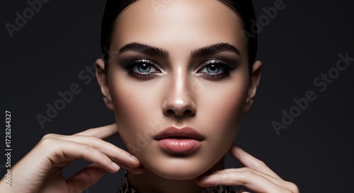 美しい女性の顔アップドラマチックな光が際立たせる完璧なメイクと輝く瞳. AI Generated