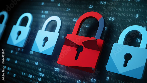 binary code lock, combination lock code. Digital padlock for computing system on a dark blue background, cyber security technology