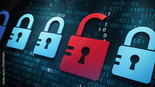 binary code lock, combination lock code. Digital padlock for computing system on a dark blue background, cyber security technology