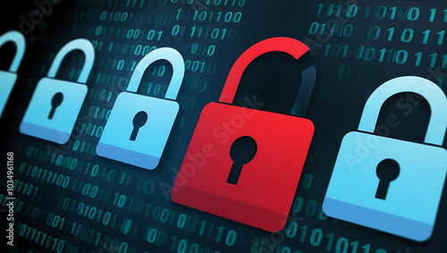 binary code lock, combination lock code. Digital padlock for computing system on a dark blue background, cyber security technology
