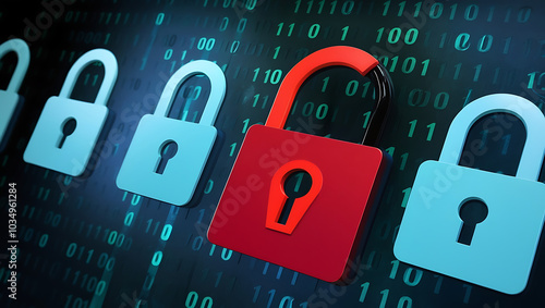 binary code lock, combination lock code. Digital padlock for computing system on a dark blue background, cyber security technology