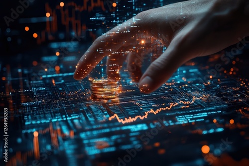 Close-up of hands stacking coins with a digital financial graph overlay displaying increasing trends. Symbolic representation of financial growth and investment.