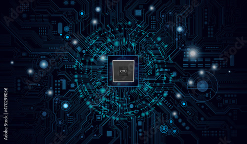 CPU Chip on Motherboard. Central Computer Processors CPU concept. Quantum computer, large data processing, database concept. Futuristic microchip processor. Digital chip.