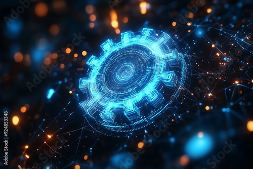 Digital 3d gear icon with binary code, artificial intelligence in system setting optimization, automation workflows, software customization options, and personalized user interfaces design