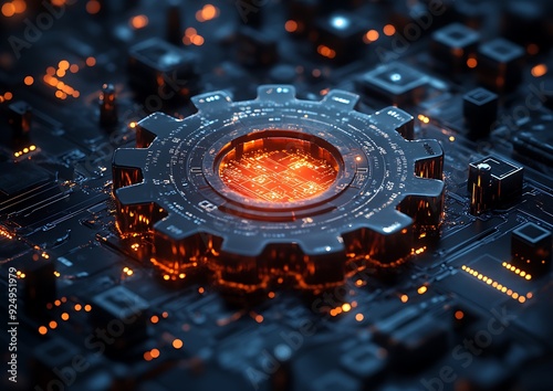 Digital 3d gear icon with binary code, artificial intelligence in system setting optimization, automation workflows, software customization options, and personalized user interfaces design