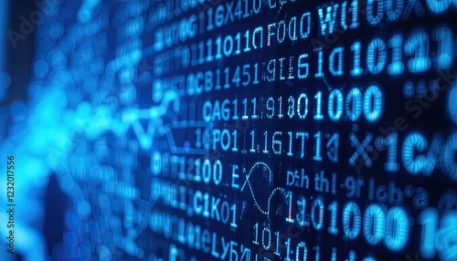 , fClose-up view of blue digital binary code streaming on a computer screen, symbolizing data processing and modern digital technology