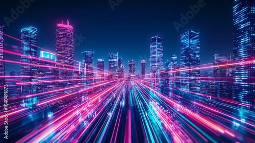 Futuristic Cityscape with Neon Light Trails and Skyscrapers