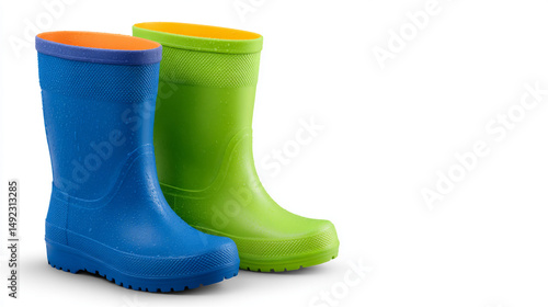 グリーンとブルーのレインブーツが白背景に置かれた商品風画像 generative ai
