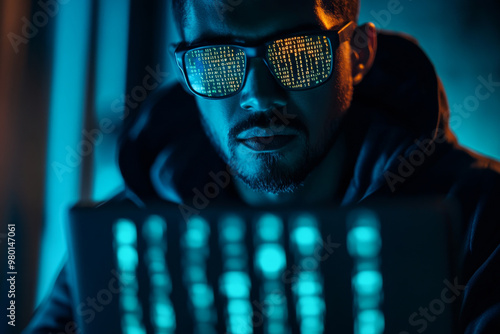 glasses reflecting the flowing matrix code, symbolizing a hacker in a digital environment.