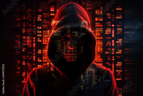 hacker silhouette. computer code. Faceless male hacker in front of animated computer code. hacker front of his computer committing digital cybercrime. Generative AI