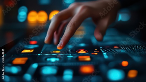 interacts with futuristic control panel, surrounded by glowing buttons, representing advanced technology and user interface design.