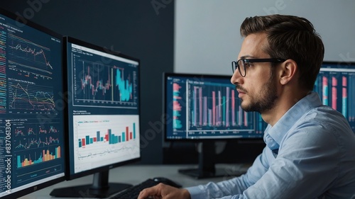 Male data analyst looking at a bunch of data Visualisation and various type of graphs on computer screens