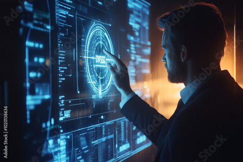man is pointing at a blue screen with a lot of dots. Concept of technology and innovation, as the man's hand is reaching out to interact with the digital display