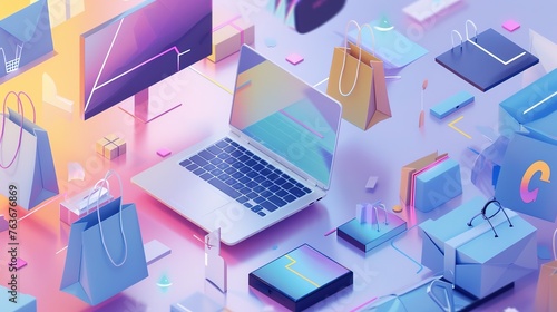 of interconnected devices such as laptops, tablets, and smartphones, with virtual shopping bags floating between them, representing the seamless shopping experience across different platforms