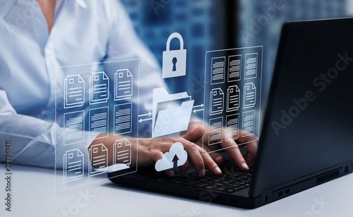 Online documentation database; document management system DMS concept. FTP (File Transfer Protocol), Secure FTP. Internet cloud technology, exchange information and data storage concept.