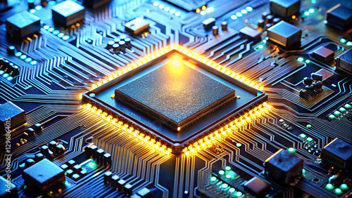 semiconductor chip on a circuit board, symbolizing technology and innovation.