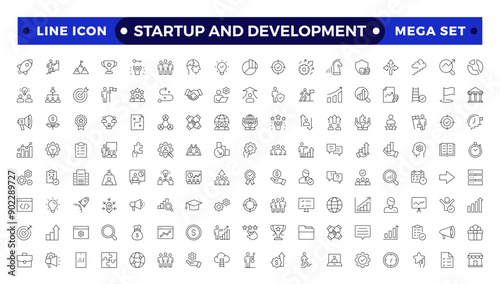 Startup and development outline icons set. Start up symbols collection. Launch, development, investment, innovation. Line icons related to project, startup, management, business.