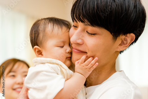 0歳の赤ちゃんに顔をくっつけられて嬉しそうなイクメンの30代の愛情いっぱいで幸せで笑顔の父親