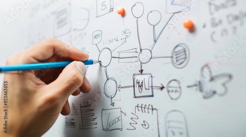 05061620 07 A hand drawing a flowchart on a whiteboard, depicting a business process. --ar 16:9 Job ID: 626fe6f7-6b68-43a9-9005-ad6fb726ae67