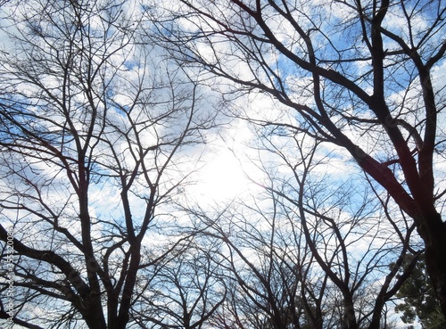 日本の田舎の風景 1月 裸木の梢と青空と雲