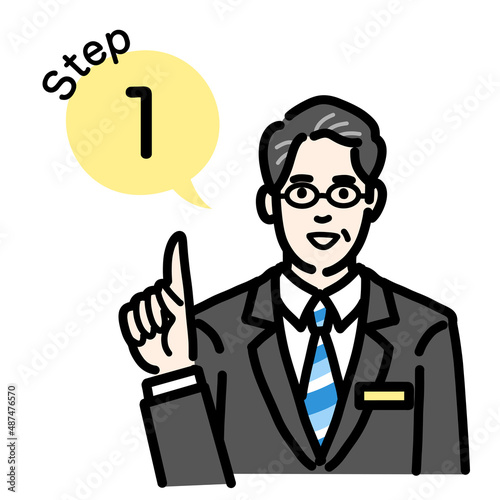ステップ1 工程を説明するバッヂのついたスーツを着たメガネをかけた中年男性