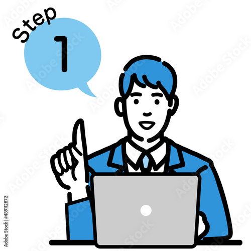 ステップ1 ラップトップの前で工程を説明するスーツを着た若い男性