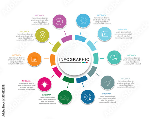 10 Steps Infographics Design Template - Graph, Pie chart, workflow layout, squire diagram, brochure, report, presentation, web design. Editable Vector
