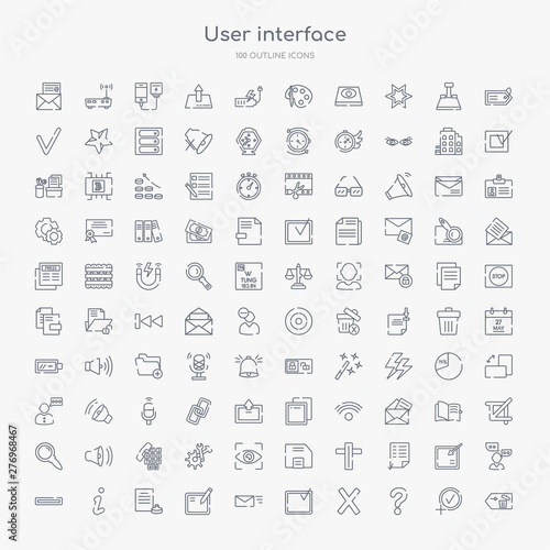 100 user interface outline icons set such as delete button, round help button, round delete button, tick box, email envelope edit list round information