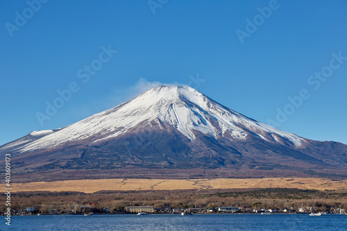 冬(12月)の朝、冠雪した富士山を山中湖の長池親水公園付近から望む 山梨県山中湖村