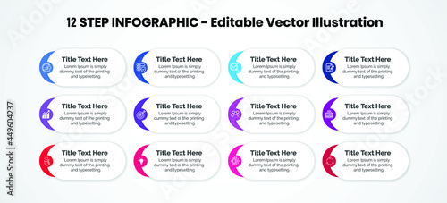 12 Steps Infographics Design Template - Graph, Pie chart, workflow layout, cycling diagram, brochure, report, presentation, web design. Editable Vector illustration