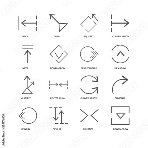 16 linear icons related to Down arrow, Back, undefined, Diagonal