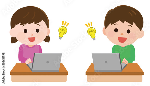 エドテック ノートパソコンを使った授業を受ける男の子と女の子2 イラスト
