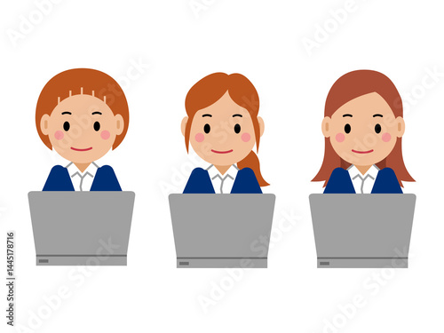 パソコンを操作する紺色スーツの若い女性。その2