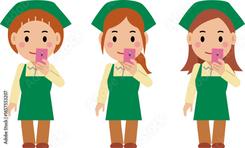 スマホを見る緑エプロンの若い女性。その2