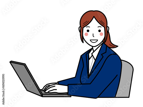 ネイビースーツ。顔が正面向きの横から見たパソコンを操作する女性。その2