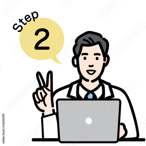 ステップ2 ラップトップの前で工程を説明する白衣を着た若い男性医師