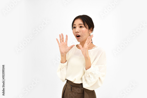 両手を広げて驚くカジュアル女性2 白背景