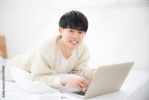 ベッドの上でうつ伏せで寝転がりパソコンをする笑顔の20代の若い男性カメラ目線 学生やフリーランスの若手のイメージ