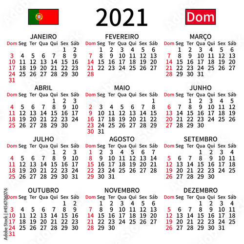 2021 year calendar. Simple, clear and big. Portuguese language. Week starts on Sunday. Sunday highlighted. No holidays. Vector illustration. EPS 8, no gradients, no transparency