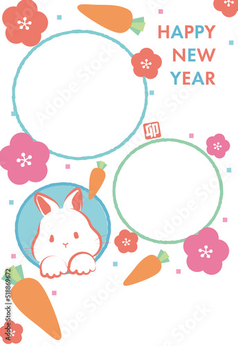 2枚の写真用ポップでカラフルな白背景の2023年卯年年賀状 添書きなし