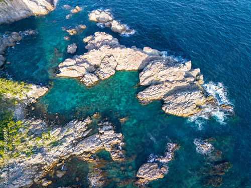 青い海と緑の森が美しい、式根島の空中ドローン撮影。