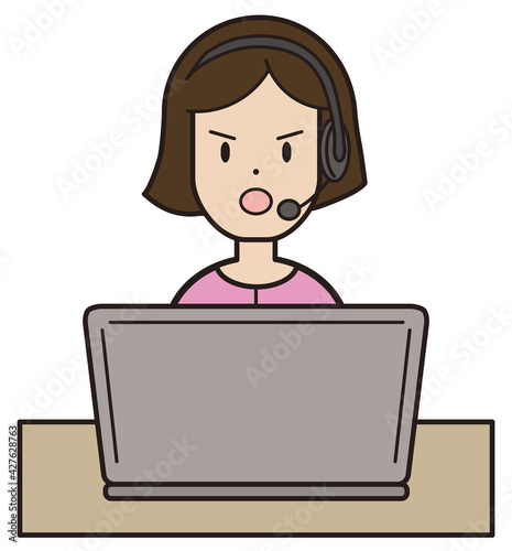 パソコン入力をしながら電話応対をするピンクの服の20代から30代女性 コールセンター 怒り顔